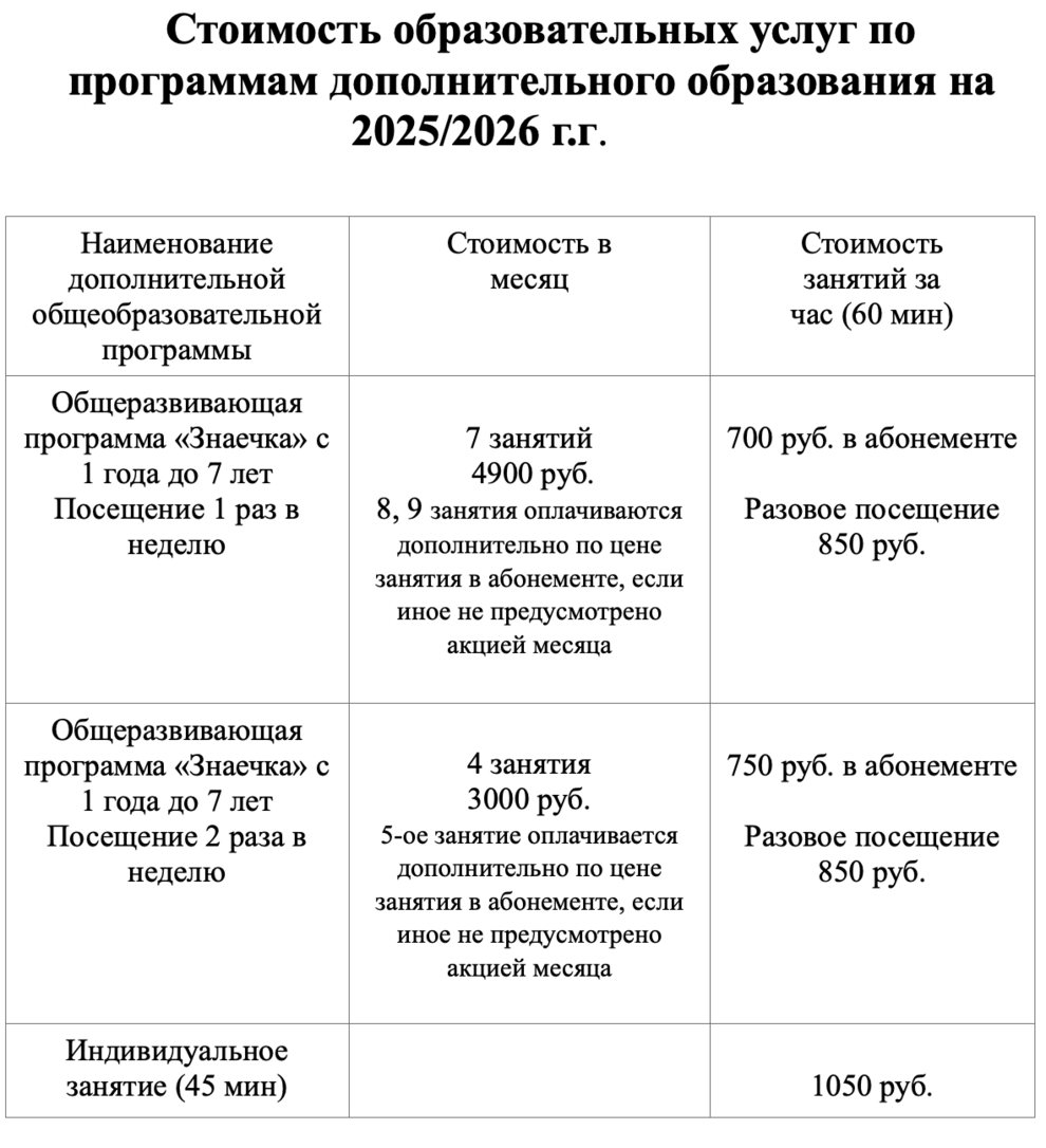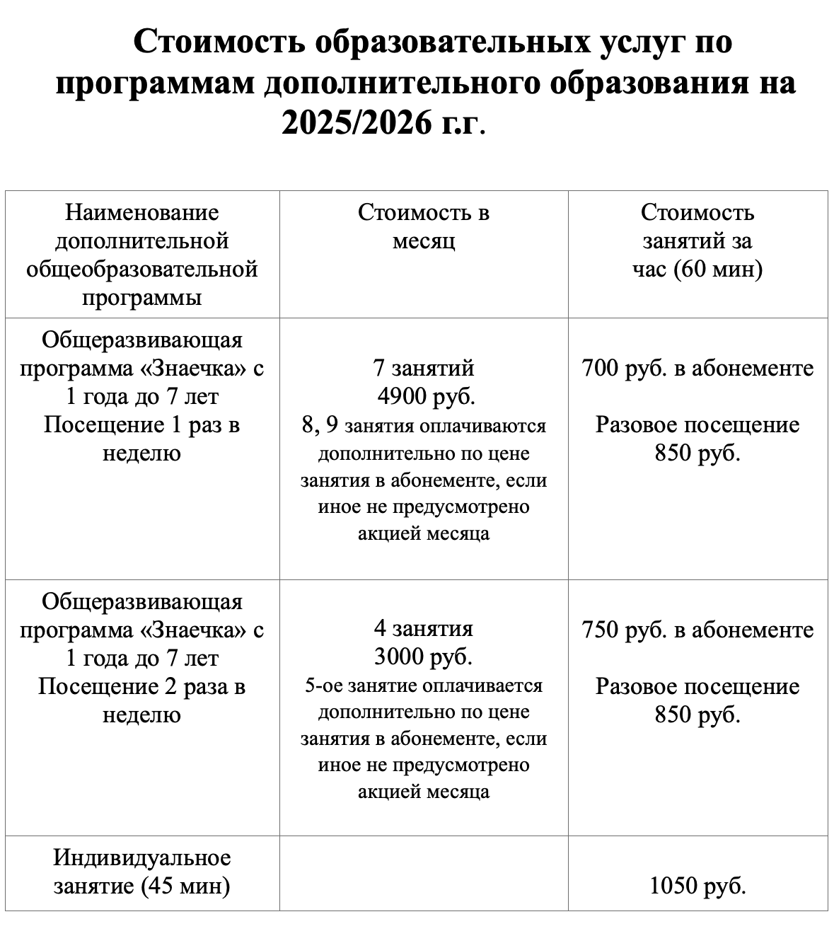 4.УСЛОВИЯ ПОСЕЩЕНИЯ 4.1. Посещая занятия в Детском центре, Клиент подтверждает, что не имеет медицинских противопоказаний для получения Услуг, имеет представление о физической и моральной нагрузке во время посещения занятий, а также о возможных последствиях для состояния здоровья в случае опоздании на занятия. 4.2. Ответственность за жизнь, здоровье и безопасность детей во время их нахождения на территории Детского центра до и после занятий, лежит на их законных представителях или сопровождающих их лицах. В случае, если предполагается, что ребенок может самостоятельно уходить из Детского центра после занятий, законному представителю этого ребенка необходимо предоставить письменное Заявление на самостоятельный уход. 4.3. За утерянные или оставленные без присмотра вещи Исполнитель ответственность не несет. Все найденные на территории центра вещи хранятся не более одного месяца, далее утилизируются. 4.4. В случае повреждения Клиентом либо лицами, находящимися вместе с ним во время посещения Детского центра, имущества Исполнителя Клиент возмещает нанесенный ущерб в полном объеме. 4.5. Для пользования Услугами Исполнителя Клиенту необходимо приобрести абонемент, который необходимо предъявлять при каждом посещении Детского центра. 4.6. В абонементе указывается наименование приобретаемых услуг и посещаемого занятия, количество посещений, включенных в абонемент, и срок действия. 4.7. Абонемент приобретается на групповые и индивидуальные занятия, начиная от 4 занятий. 4.8. Количество занятий в абонементе на групповые занятия на календарный месяц зависит от количества официальных рабочих, выходных и праздничных дней, а также установленного режима работы в Детском центре, и в каждом месяце может быть различным. При этом стоимость абонемента меняется. 4.9. Стоимость абонемента устанавливается в зависимости от вида, продолжительности и количества посещений в неделю в соответствии с действующим Прейскурантом цен на услуги. 4.10. В случае внесения Исполнителем изменений в Прейскурант цен на услуги, стоимость абонемента, приобретенного до изменения цен, не меняется. 4.11. Абонемент считается оплаченным в момент поступления денежных средств на расчетный счет или кассу Исполнителя. 4.12. В случае отсутствия инструктора (тренера, педагога), Исполнитель может его заменить либо перенести занятия на другое время. При отказе Клиента от посещения занятий в случае замены постоянного инструктора (тренера, педагога) или времени проведения занятий, стоимость пропущенных Клиентом занятий не компенсируется. 4.13. В случае отмены занятия Исполнителем и отсутствия возможности перенести его на другое время, стоимость этих занятий зачитывается при приобретении следующего абонемента. 4.15. В случае нахождения Ребенка в стационаре (больнице) на лечении ипри наличии подтверждающего документа из медицинского учреждения Исполнитель может перенести оплату пропущенных занятий полностью на следующий месяц. 4.16. В случае пропуска индивидуальных занятий по причине болезни, при условии предупреждения Исполнителя заранее (не позже чем накануне до 19.00 часов) оплата занятия сохраняется бессрочно при этом время, закрепленное в расписании за Заказчиком сохраняется в течение 2 (двух) недель. 4.17. В случае пропуска групповых занятий по причине болезни и при наличии копии п