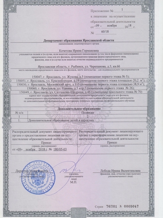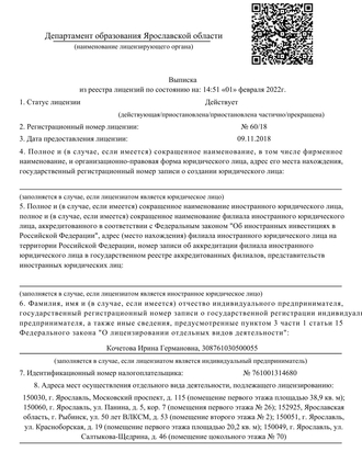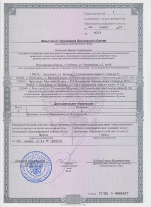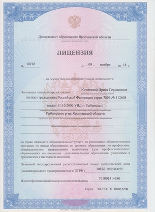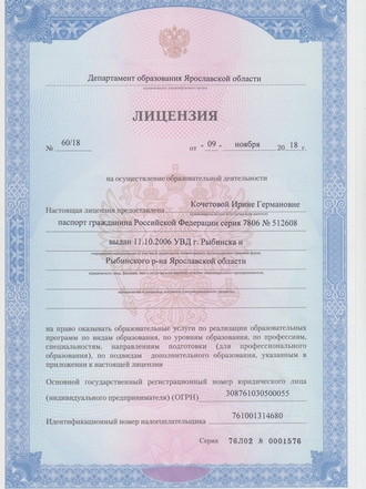 Индивидуальный предприниматель Кочетова Ирина Германовна, именуемый в дальнейшем "Детский центр «Знаечка", предлагает любому физическому лицу, в дальнейшем именуемому «Клиент», заключить договор на указанных ниже условиях. Настоящее предложение, в соответствии с п.2 ст. 437 Гражданского кодекса РФ является Публичной офертой (далее – Договор), полным и безоговорочным принятием (акцептом) условий которой в соответствии со ст. 438 Гражданского кодекса РФ является осуществление Клиентом первой оплаты предложенных Детским центром услуг в порядке, определенном настоящим Договором. Акцепт оферты означает, что Клиент согласен со всеми положениями настоящего предложения, и равносилен заключению договора об оказании услуг. Датой заключения договора считается дата внесения оплаты. Акцептируя данную оферту, Клиент подтверждает расторжение ранее заключенных с Детским центром договоров на оказание услуг. 1. ПРЕДМЕТ ДОГОВОРА 1.1. Детский центр обязуется предоставить, а Клиент, являющийся родителем (законным представителем) ребенка, в отношении которого заключен настоящий Договор, обязуется принять и оплатить на условиях настоящего Договора следующие услуги: 1.1.1. Услуги по организации развивающего досуга детей в возрасте от 1 года до 7 лет; 1.1.2. Услуги по организации досуга оказываются в группах и в индивидуальном порядке по адресу: г. Ярославль, ул. Жукова, д. 5; 1.1.3. Оплата услуг производится в соответствии с утвержденным прайс-листом Детского центра и разделом 3 Договора.